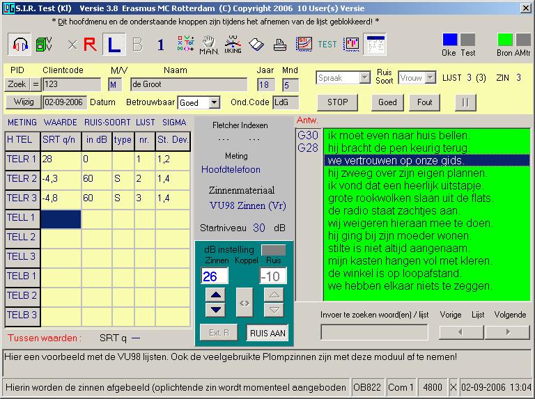 Zeer uitgebreide softwaremoduul die vrijwel alle metingen binnen de spraak-in-ruis test ondersteund. Metingen met de hoofdtelefoon en metingen in het vrije-veld zijn mogelijk. Een verregaande vorm van automatisering is met deze moduul mogelijk daar de sturing van audiometer en de sturing van het zinsmateriaal en de berekening van alle resultaten geheel automatisch worden uitgevoerd. Alle resultaten kunnen in één tabel worden getoont waardoor een goed vergelijk mogelijk is. Alle berekeningen zoals S/R verhouding, standaardvariatie, gebruikte lijst e.t.c. worden berekend en opgeslagen. Metingen die zijn afgebroken kunt u opnieuw uitvoeren met als start de ingelezen eerder gemeten gegevens. Mogelijkheden om zinsmateriaal via CD-Rom of harde schijf af te spelen en volledig te besturen zijn aanwezig. Al het in Nederland gangbare zinsmateriaal wordt ondersteund (Plompzinnen / VU Lijsten) en bijna alle audiometers met een RS232 interface kunnen worden gekoppeld! De aangesloten audiometers worden door het programma geheel automatisch ingesteld.